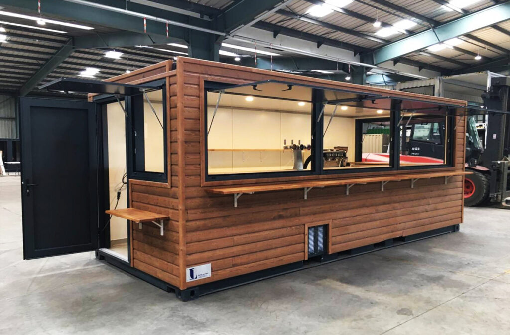 Conteneurs transformés en espaces commerciaux modernes et personnalisés. Idéaux pour marchés, événements et emplacements fixes.
